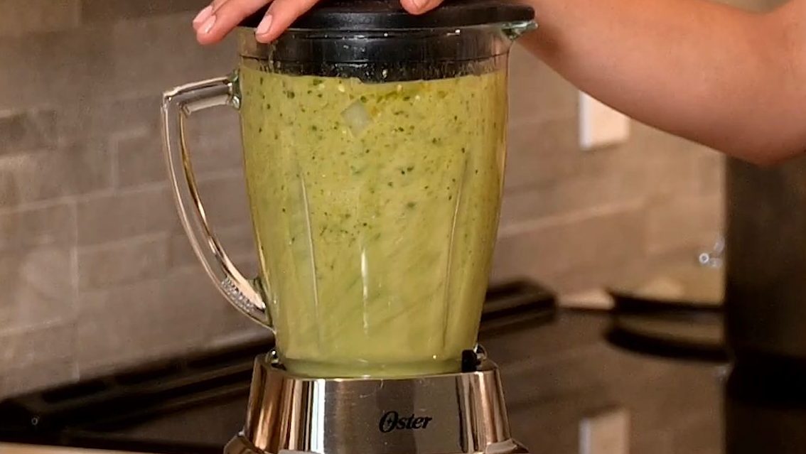Mix all the ingredients in a blender, adding 1 cup of the chicken brot, 3ts of salt, 3 ts of oregano, and 2 garlic cloves.